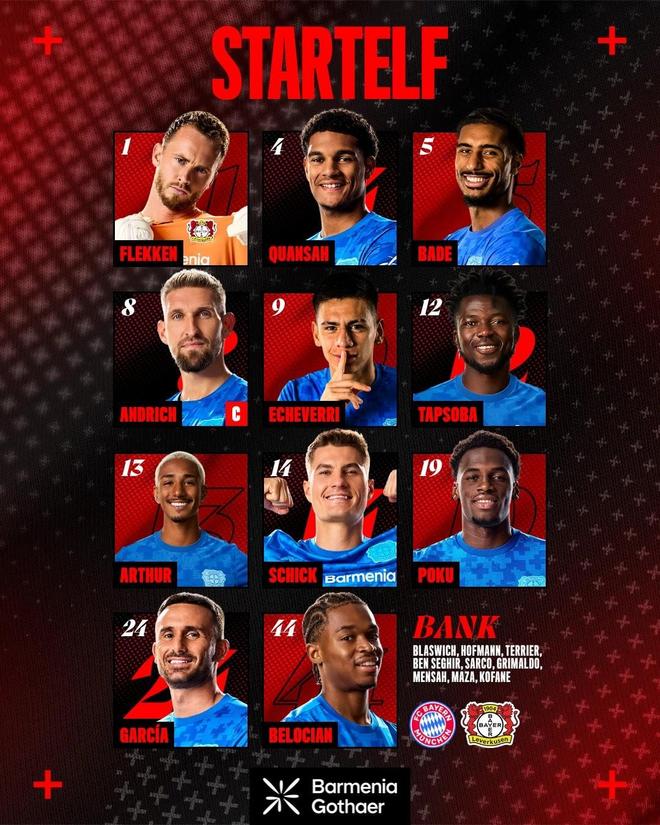 勒沃库森首发:1-弗莱肯、44-贝洛西安、12-塔普索巴、5-巴代、4-夸安萨、8-安德里希、24-阿莱士-加西亚、13-阿图尔、19-波库、14-希克、9-埃切韦里